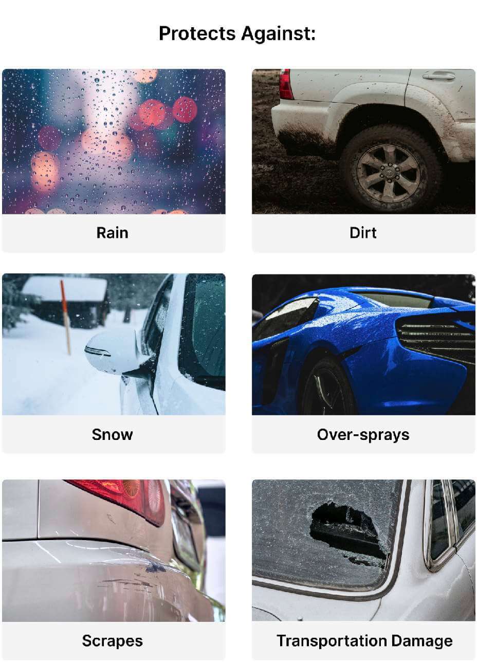 - Protects car interiors from dirt, dust, snow, rain, and overspray